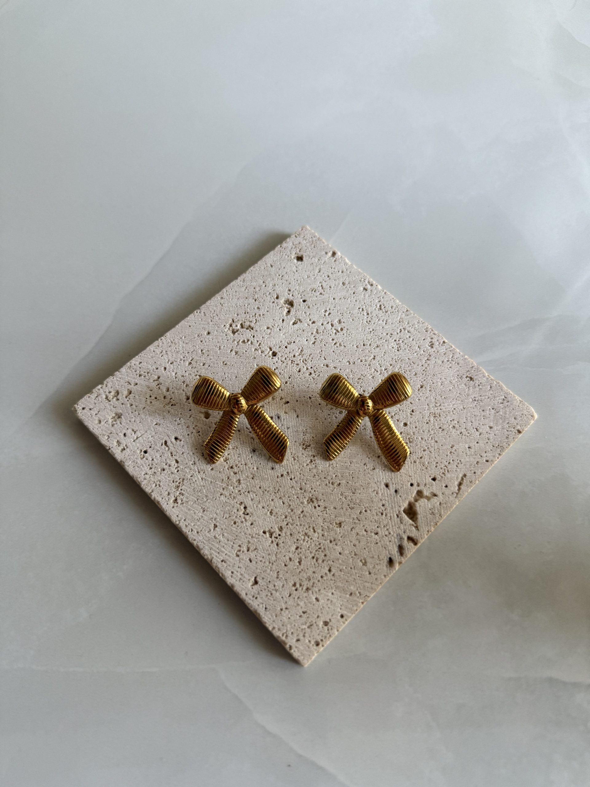 Ρομαντικά χρυσά σκουλαρίκια σε σχήμα φιόγκου που προσθέτουν κομψότητα και θηλυκή λεπτομέρεια σε κάθε εμφάνιση.