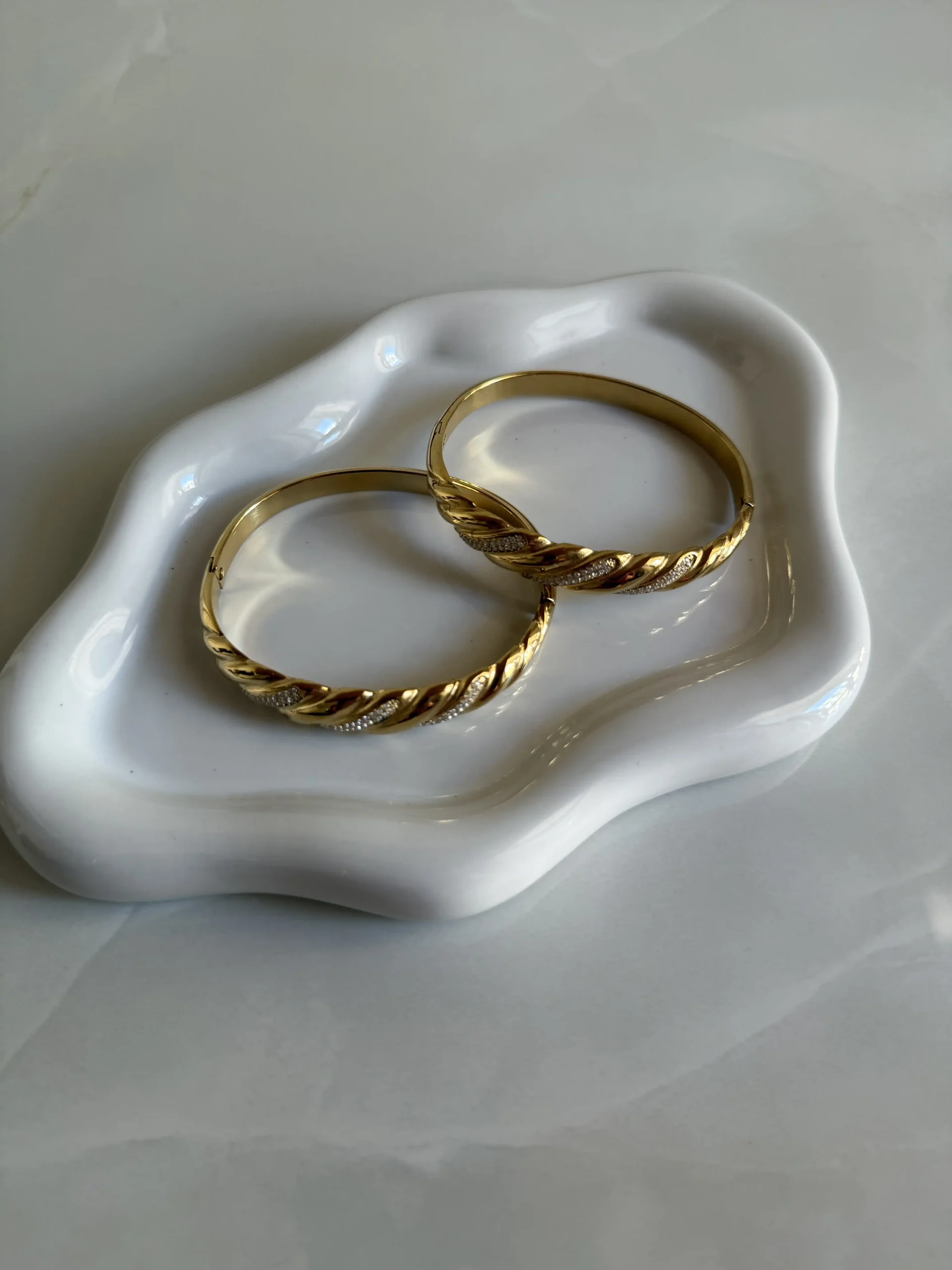 Το Helios Twist Bangle είναι ένα κομψό και δυναμικό κόσμημα που ξεχωρίζει για τον πλεγμένο, ανάγλυφο σχεδιασμό του. Η χρυσή επιφάνειά του δημιουργεί έντονη λάμψη, ενώ οι λεπτές γραμμές μικρο-ζιργκόν προσθέτουν διακριτική πολυτέλεια. Η σταθερή του μορφή τύπου χειροπέδα αγκαλιάζει όμορφα τον καρπό και προσφέρει άνετη εφαρμογή. Φοριέται μόνο του για minimal chic αποτέλεσμα ή συνδυάζεται εύκολα με άλλα λεπτά βραχιόλια για πιο σύγχρονο layering. Ένα διαχρονικό κόσμημα που αποπνέει κομψότητα και αυτοπεποίθηση.