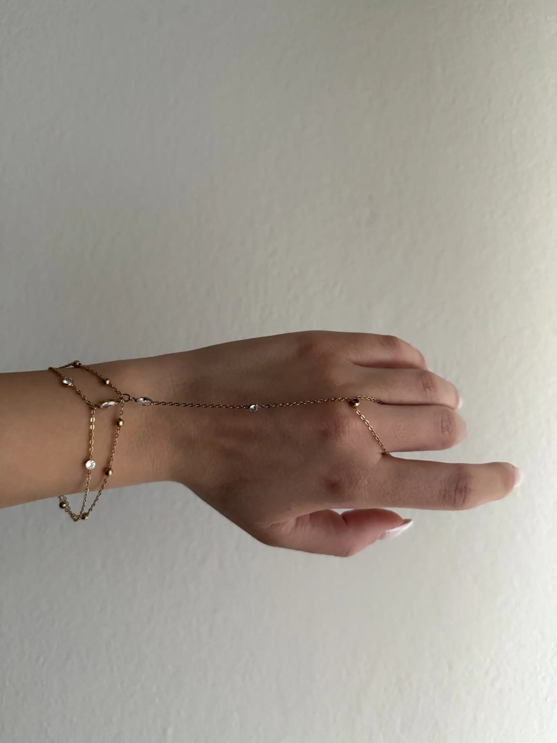 Το Kylie Gold είναι ένα εκλεπτυσμένο hand chain σχεδιασμένο για να αγκαλιάζει φυσικά τον καρπό και να ακολουθεί αρμονικά τη γραμμή του χεριού μέχρι το δάχτυλο. Η λεπτή αλυσίδα σε χρυσό τόνο δημιουργεί ένα κομψό και ισορροπημένο αποτέλεσμα, ενώ τα μικρά κρύσταλλα προσθέτουν διακριτική λάμψη χωρίς υπερβολή. Ο minimal σχεδιασμός του το καθιστά ιδανικό για καθημερινή χρήση, αλλά και για πιο ιδιαίτερες εμφανίσεις. Φοριέται μόνο του για καθαρή, κομψή αισθητική ή συνδυάζεται εύκολα με άλλα λεπτά κοσμήματα για ένα πιο layered αποτέλεσμα.