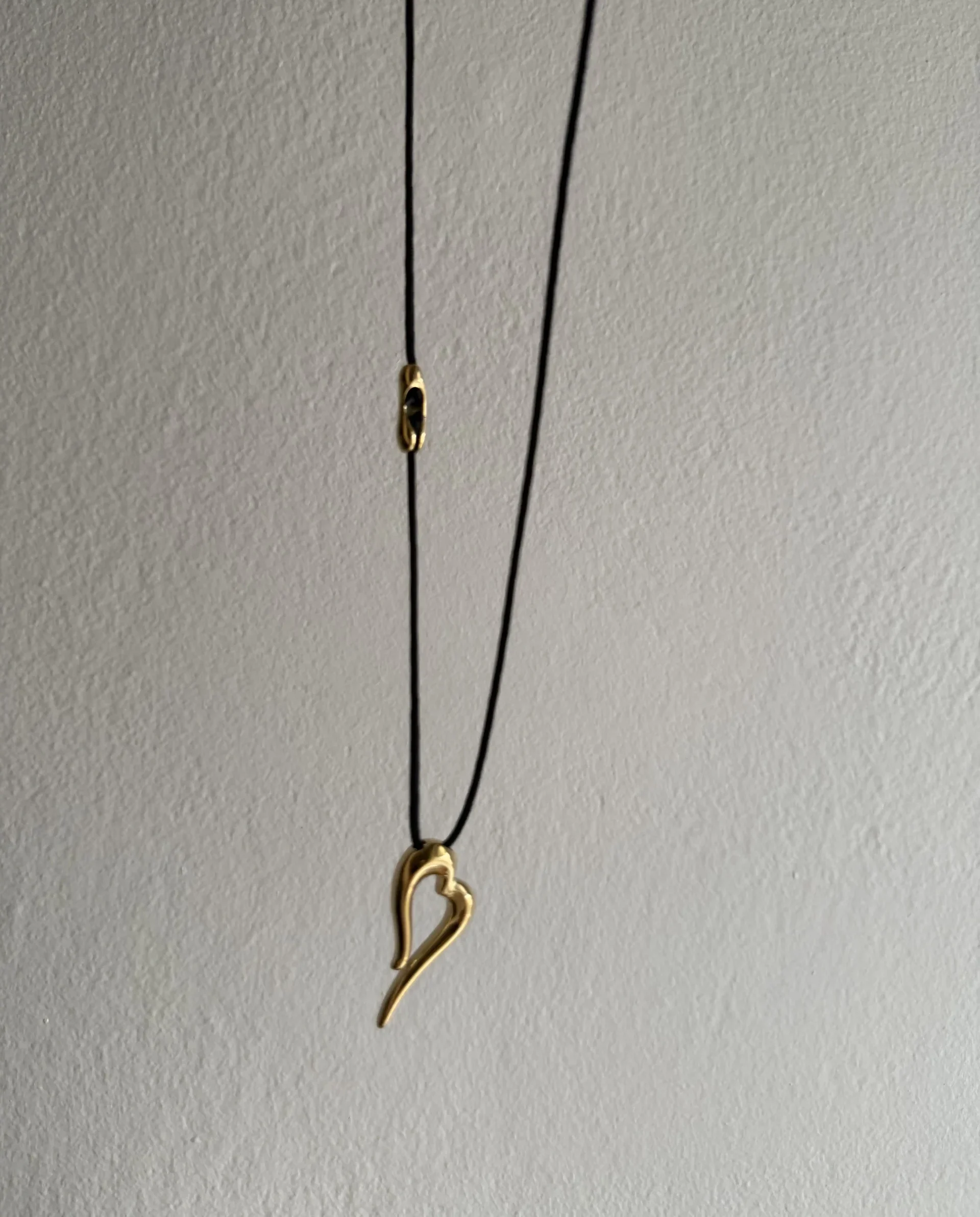 Minimal κολιέ με μαύρο κορδόνι και χρυσό heart pendant σε κομψό, ρευστό σχήμα.