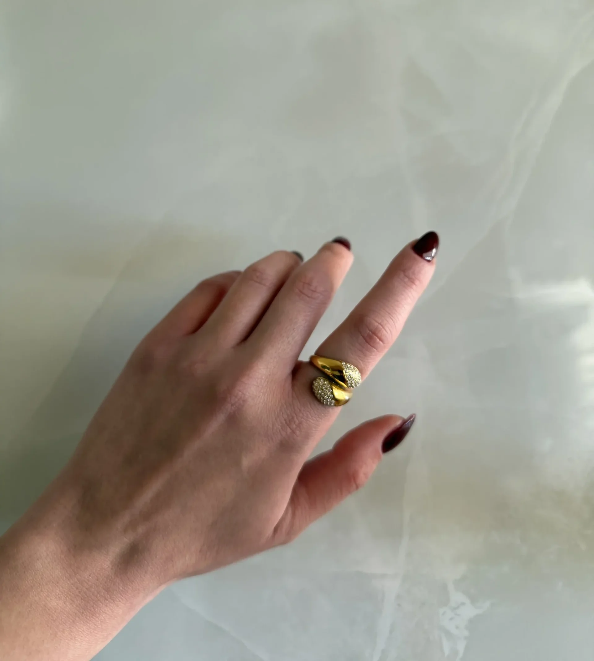 Το Lumera ring συνδυάζει τη ρευστή, καμπύλη φόρμα με τη διακριτική λάμψη των μικρών κρυστάλλων, δημιουργώντας ένα κόσμημα που ισορροπεί ανάμεσα στο bold και το refined. Το crossover σχέδιο αγκαλιάζει το δάχτυλο με κομψότητα, ενώ η pavé επιφάνεια προσθέτει φωτεινότητα και πολυτελή αίσθηση χωρίς υπερβολή. Είναι το ιδανικό κομμάτι για βραδινές εμφανίσεις, αλλά και για όσες θέλουν να προσθέσουν glam χαρακτήρα σε ένα minimal outfit. Το Lumera δεν είναι απλώς ένα δαχτυλίδι είναι σημείο εστίασης.