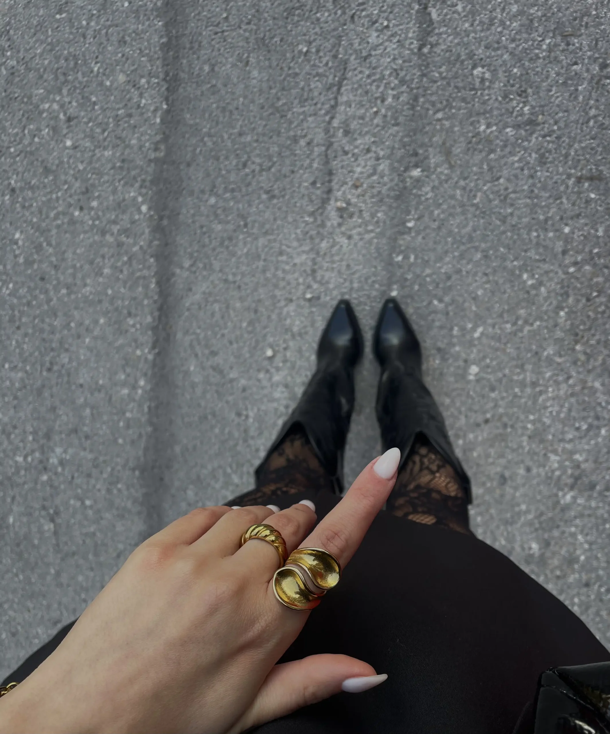 Το Medea ring είναι ένα εντυπωσιακό, γλυπτικό δαχτυλίδι με διπλή οργανική καμπύλη που δημιουργεί την αίσθηση ρευστού χρυσού σε κίνηση. Οι μαλακές, κυματιστές γραμμές του αγκαλιάζουν το δάχτυλο, σχηματίζοντας ένα δυναμικό αλλά κομψό statement. Η υψηλής γυαλάδας επιφάνειά του αντανακλά το φως έντονα, αναδεικνύοντας τη ρευστή του μορφή και χαρίζοντας σύγχρονη πολυτέλεια. Ιδανικό για minimal looks που χρειάζονται ένα bold, fashion-forward στοιχείο. Ένα κομμάτι που ισορροπεί ανάμεσα στη δύναμη και τη θηλυκότητα.