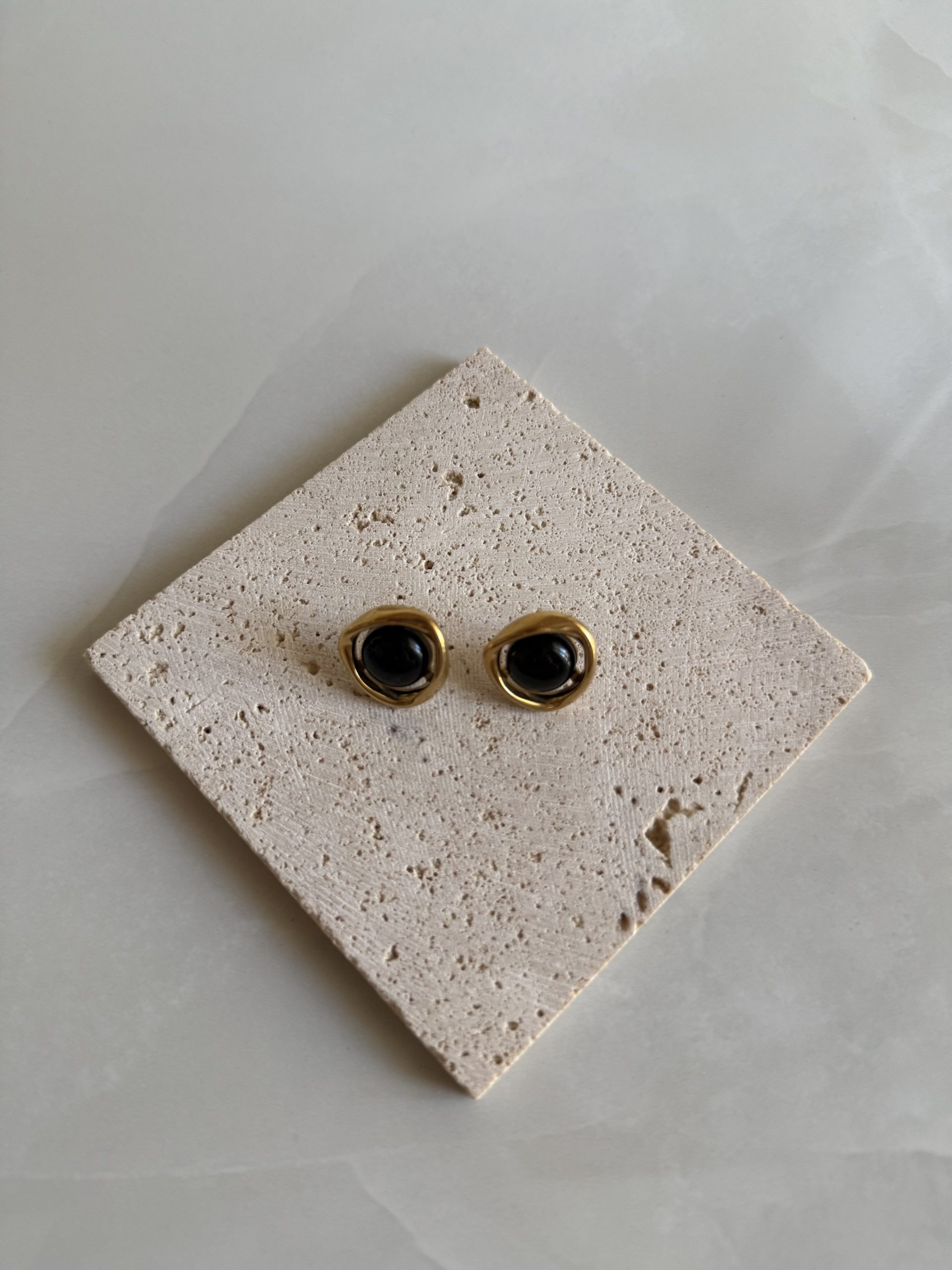 Τα Noira Black earrings είναι ένα κομψό και διαχρονικό ζευγάρι σκουλαρίκια που ξεχωρίζει για τη βαθιά μαύρη πέτρα στο κέντρο τους. Η πέτρα περιβάλλεται από ένα ιδιαίτερο χρυσό πλαίσιο με οργανικές καμπύλες, δημιουργώντας έναν μοντέρνο αλλά ταυτόχρονα elegant σχεδιασμό. Ο συνδυασμός του χρυσού μετάλλου με το έντονο μαύρο χρώμα προσφέρει μια αίσθηση πολυτέλειας και minimal αισθητικής, κάνοντάς τα ιδανικά τόσο για καθημερινές εμφανίσεις όσο και για πιο βραδινά looks. Ένα κόσμημα που μπορεί να φορεθεί εύκολα μόνο του ή να συνδυαστεί με άλλα κοσμήματα για ένα πιο ολοκληρωμένο στυλ.